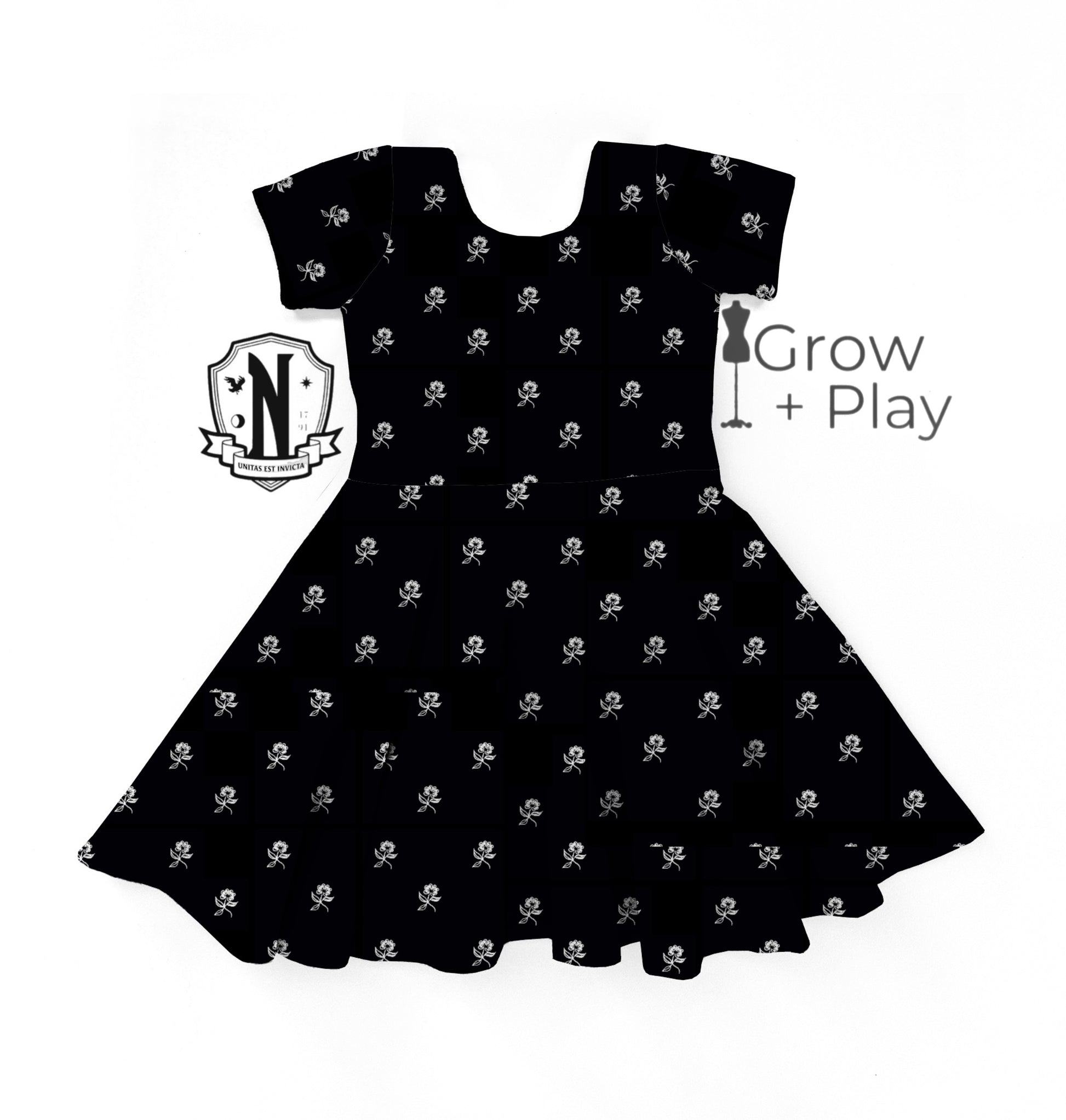 “A gothic twist on classic charm—this black twirl dress features an all-over white rose pattern, perfect for any little Nevermore fashionista.”